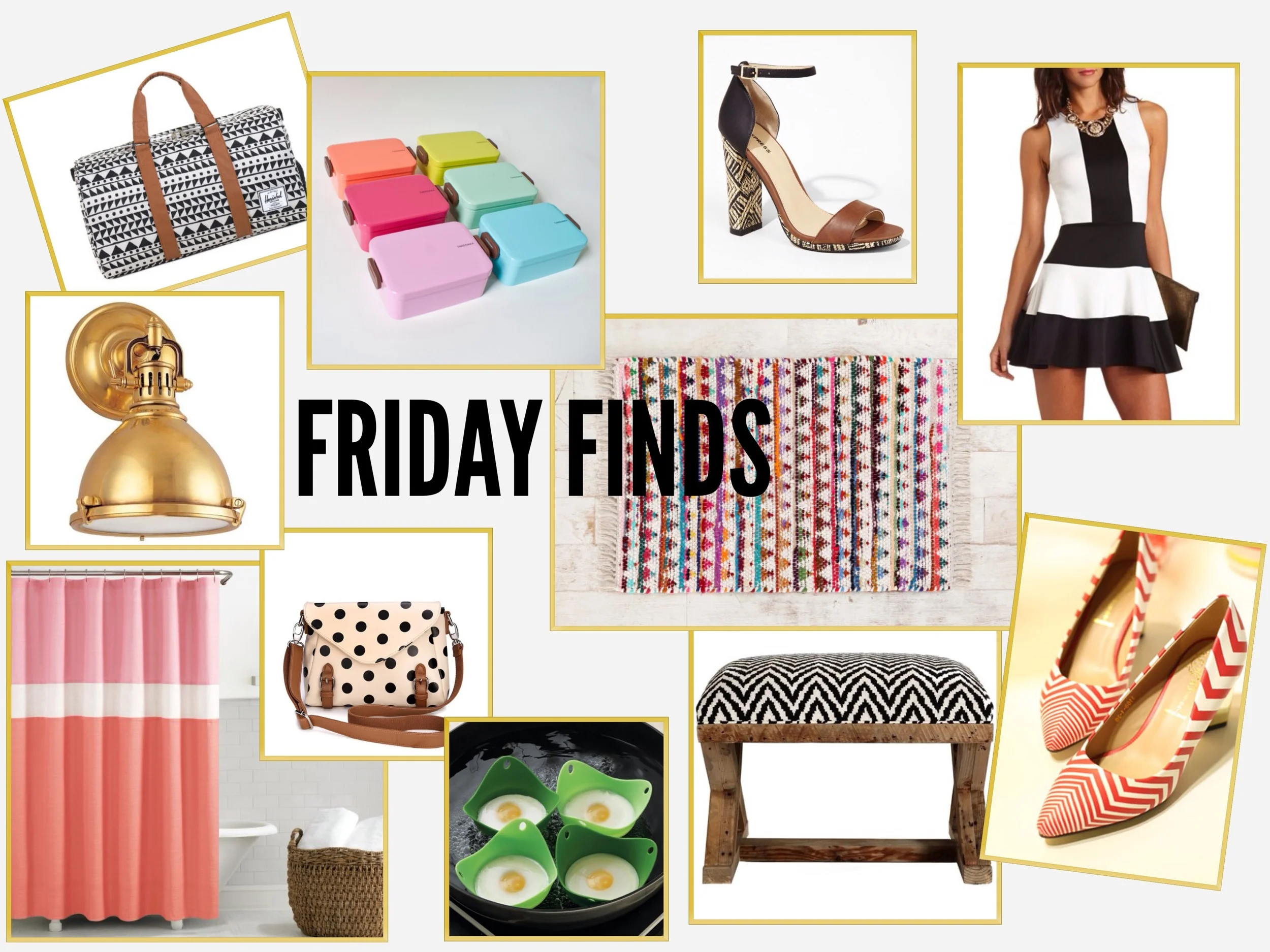 From left, clockwise: Black Chevron Weekender Bag | Takenaka Microwaveable Food Storage Bento Boxes | Basket Weave Heeled Sandal | Black and White Color Block Dress | Right Angles Color Woven Rug | Pointed Toe Red Chevron Flats | Geometric Black and White X-Base Ottoman | Poached Egg Pods | Polka Dot Messenger Bag | Kate Spade Spring Street Shower Curtain | Pelham Wall Light
